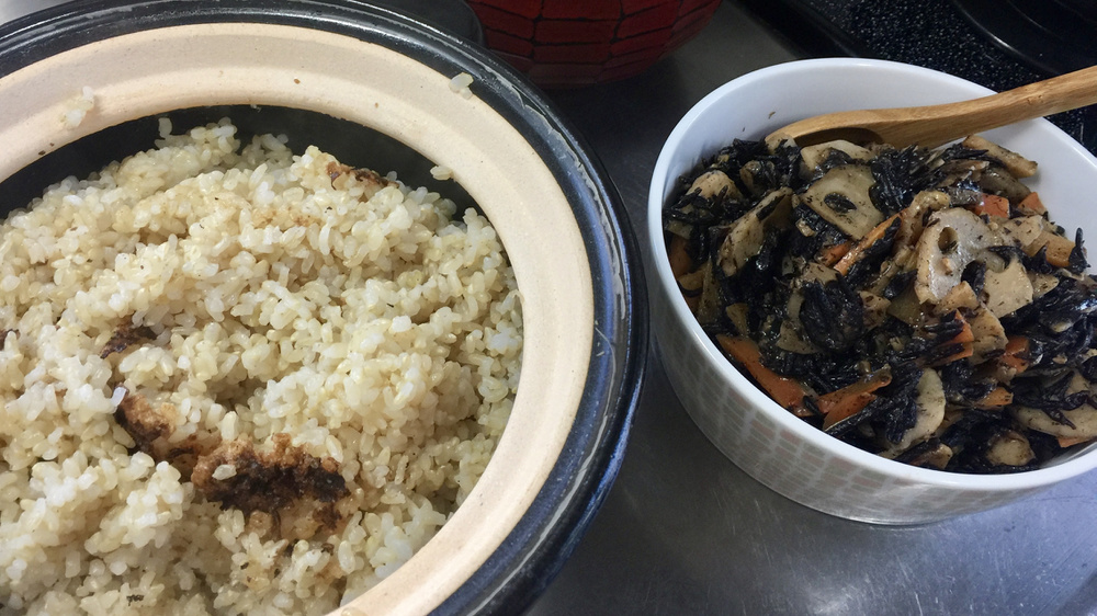 土鍋で炊く玄米ご飯、そしてレンコンや人参の入ったひじきの煮物。醤油麹で味付けします。